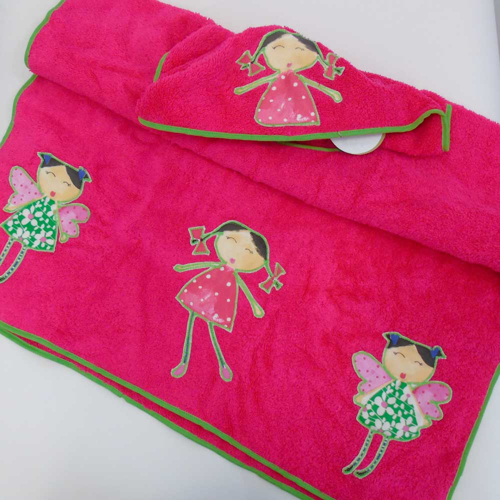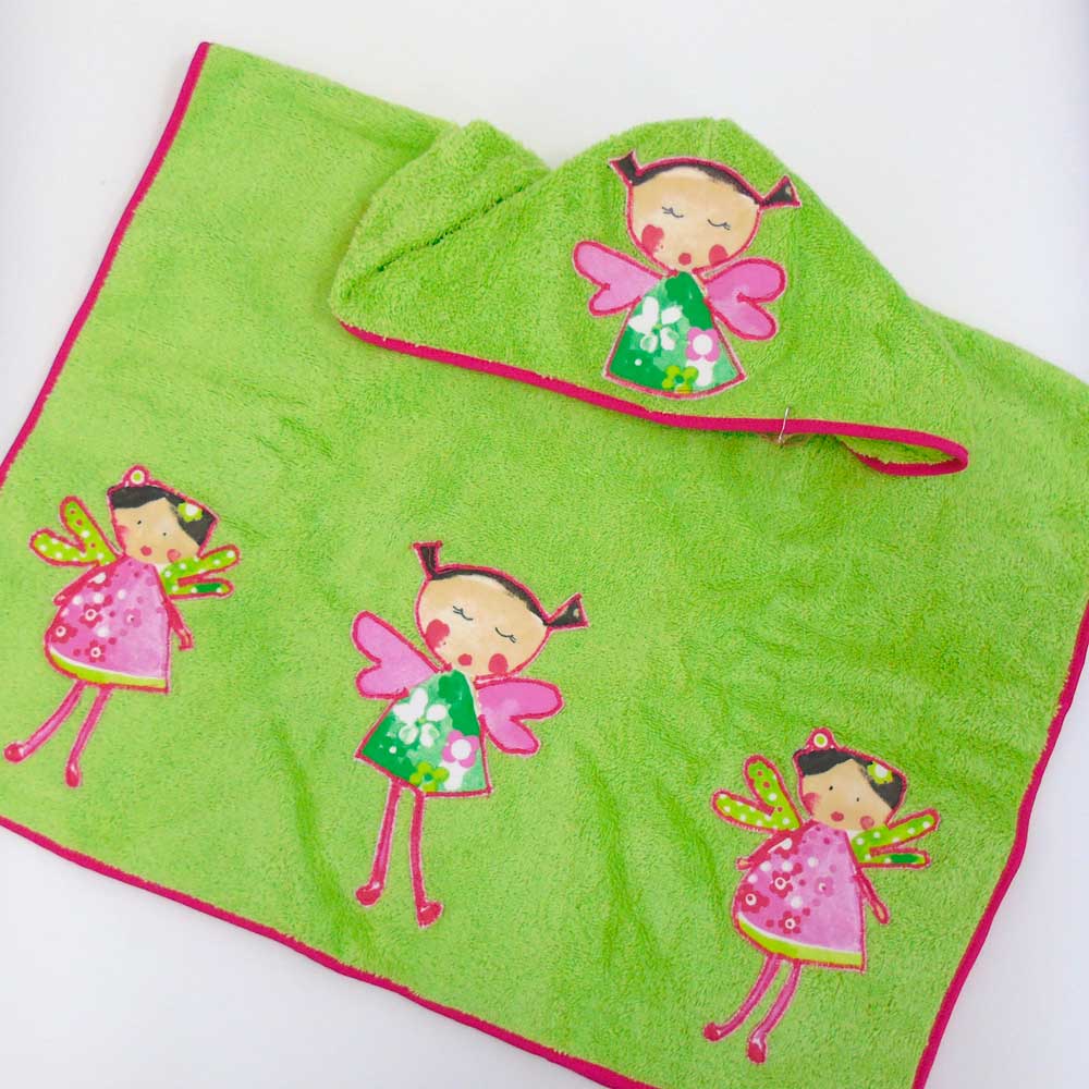 Divertente poncho accappatoio in spugna di cotone colorato con simpatiche fatine applicate a mano.