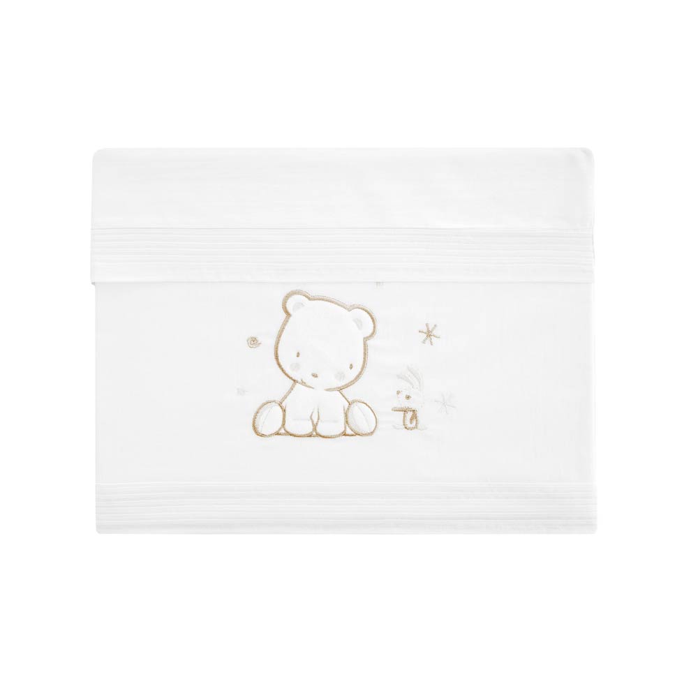 Il tutto in cotone 100%. Il completo lenzuola Orsetto di Pirulos è caratterizzato da eleganti ricami.