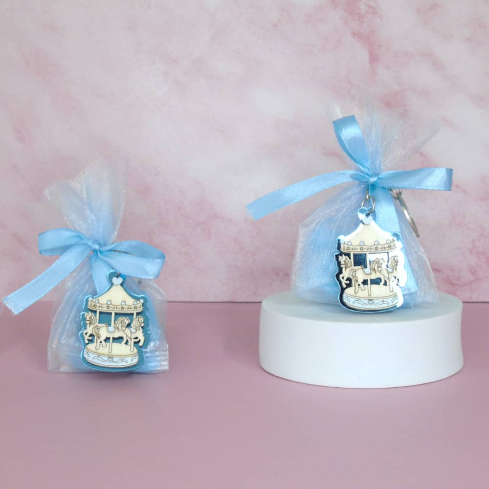 Il sacchettino confetti segnaposto è una bomboniera per nascita e battesimo completa di confetti, bigliettino e un portachiavi a forma di giostrina.