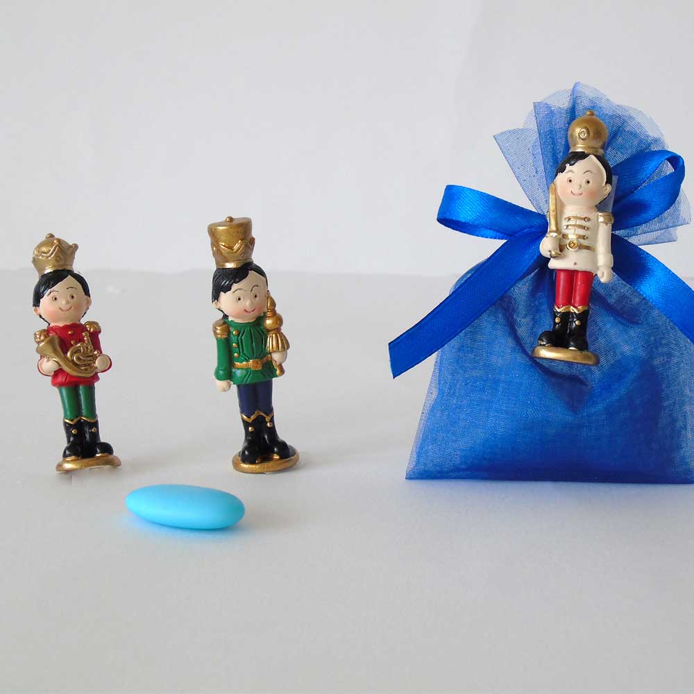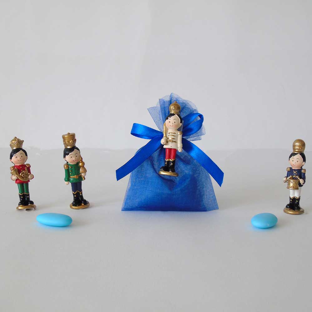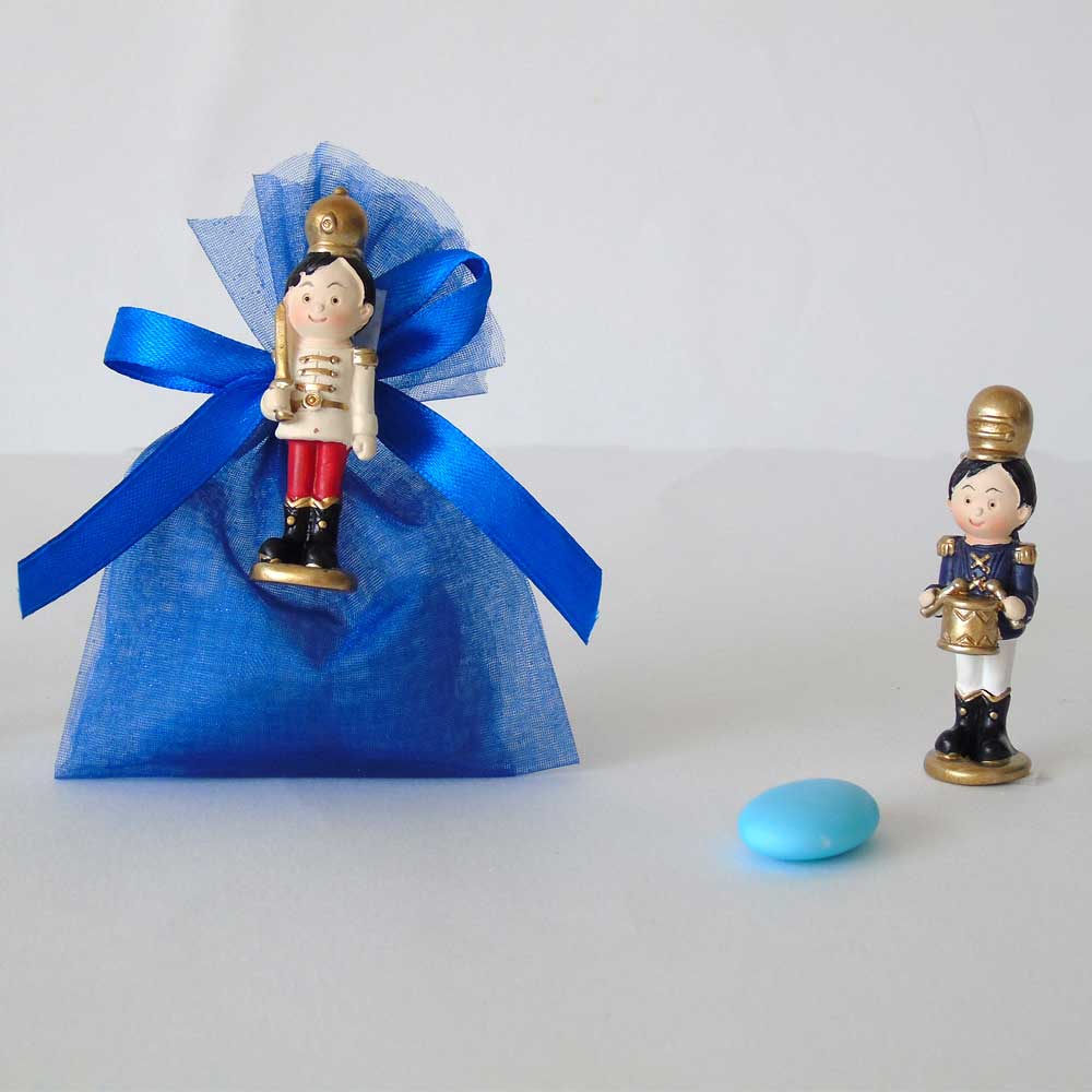 Sacchettino confetti segnaposto è una originale bomboniera per nascita e battesimo completo di confetti, bigliettino e calamita a forma di soldatino.