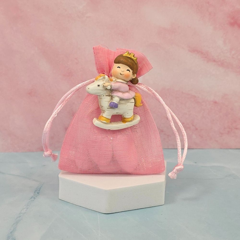 Il sacchettino confetti segnaposto è¨ una originale bomboniera per nascita e battesimo completo di confetti, bigliettino e calamita a forma di principessa su cavallo a dondolo.