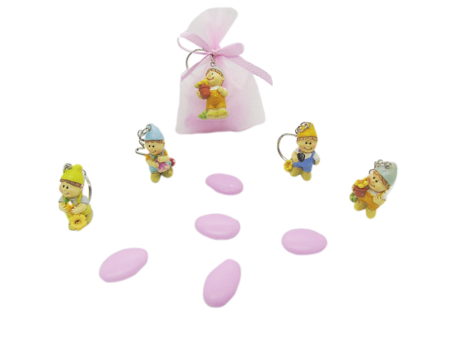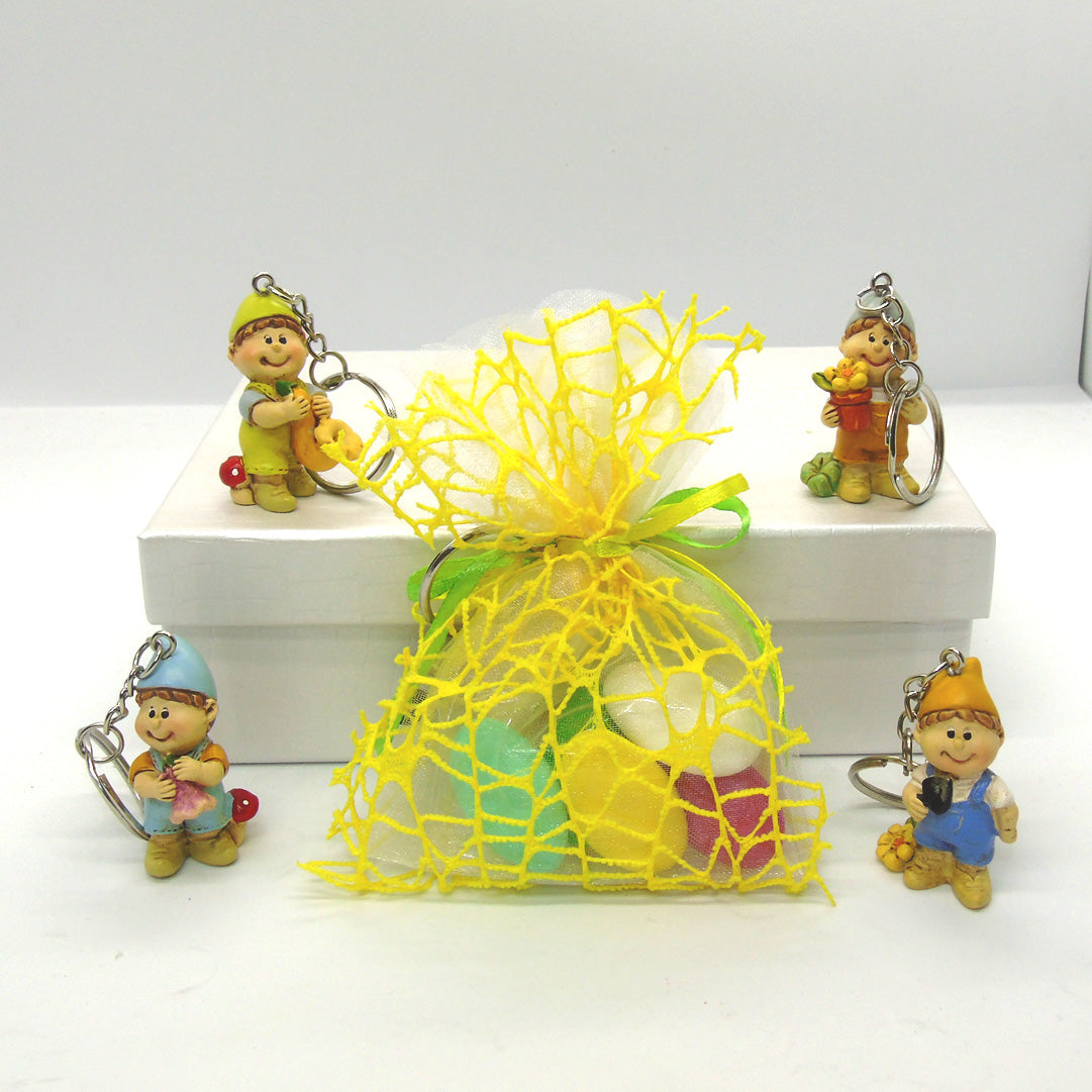 Ogni sacchettino è in tulle e contine un portachiavi, una bustina sigillata con 5 confetti di cioccolata e un bigliettino personalizzato.