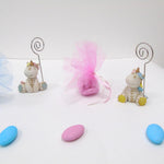 Ogni unicorno portafoto è in resina e misura 6 x 3 x 9 h cm circa.